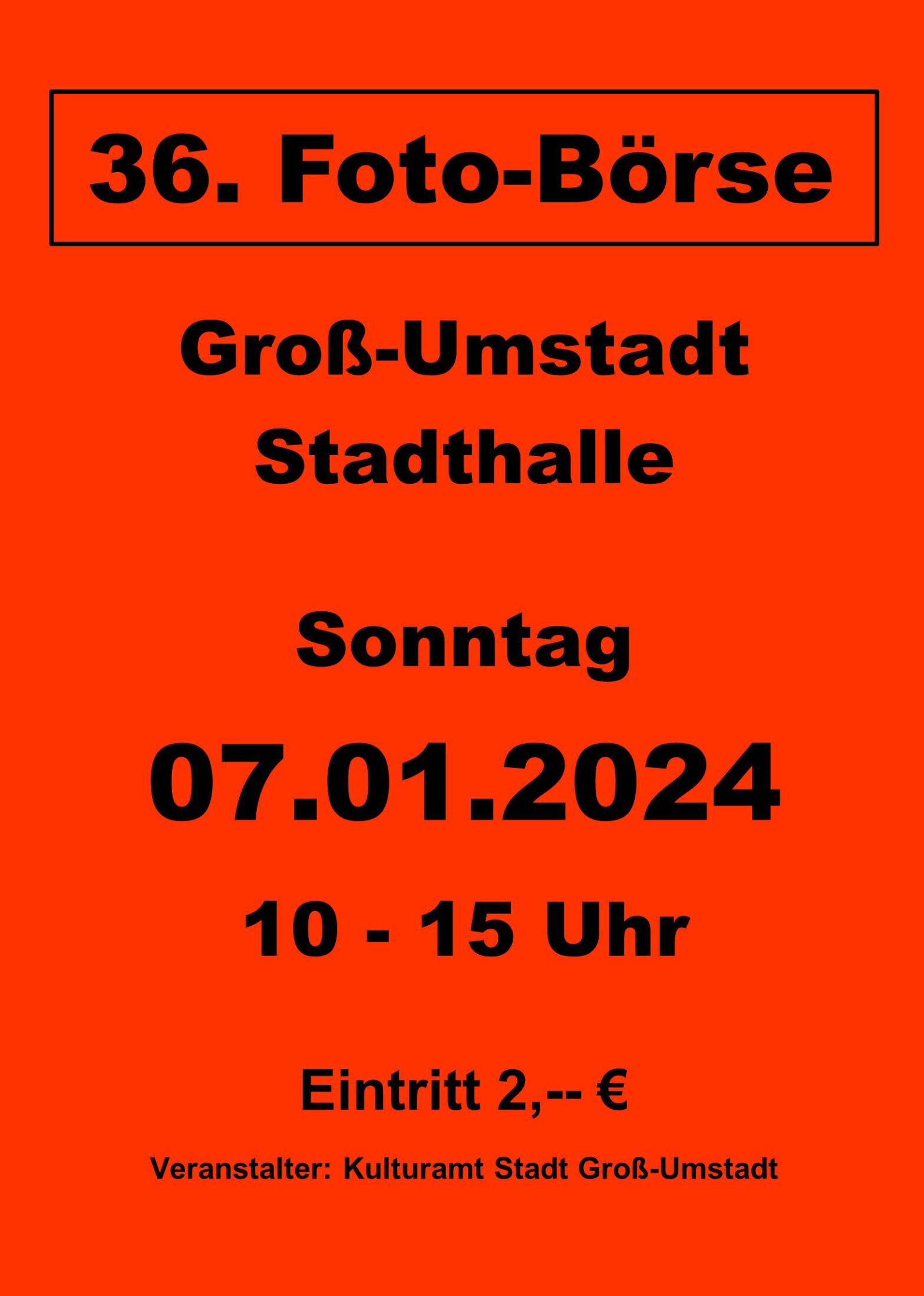 38. Umstädter Foto-Börse 4. Januar 2026 von 10-15 Uhr in der Stadthalle Groß-Umstadt Kauf/ Verkauf/Tausch von analogen und digitalen Fotogeräten. Brötchen, Kuchen und Getränke sind ebenfalls im Angebot. Eingeladen sind… 38. Umstädter Foto-Börse weiterlesen