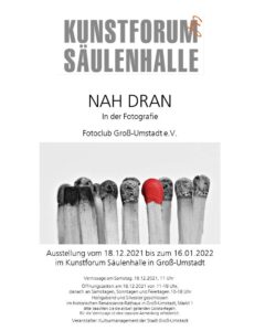 Die ursprünglich für 2020/2021 geplante 5. Ausstellung über den Jahreswechsel „Nah dran – in der Fotografie“ konnte mit der Finissage am 16. Januar 2022 erfolgreich abgeschlossen werden.