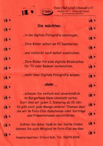 Mit der Anschaffung von Beamer und Laptop für Bildpräsentation, Bildbearbeitung und Fortbildung (Workshops) hat die digitale Fotografie auch beim Fotoclub Einzug gehalten. Den aktiven Mitgliedern wurden grundlegende Bereiche des Themas an mehreren Clubabenden mit Präsentationen und Workshops näher gebracht.