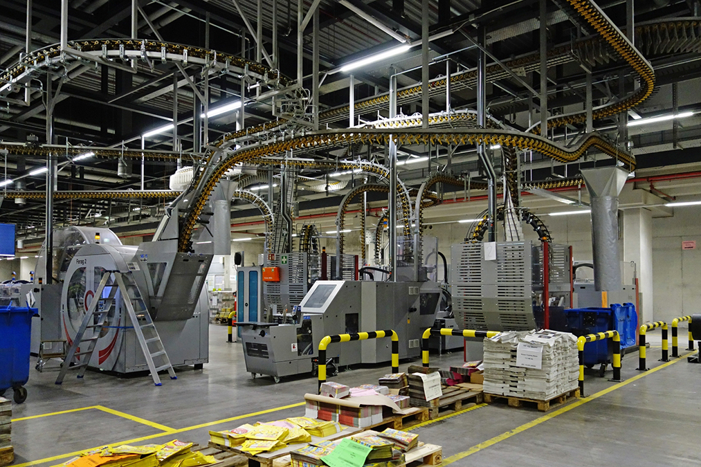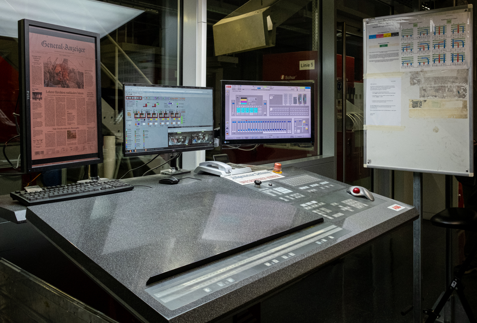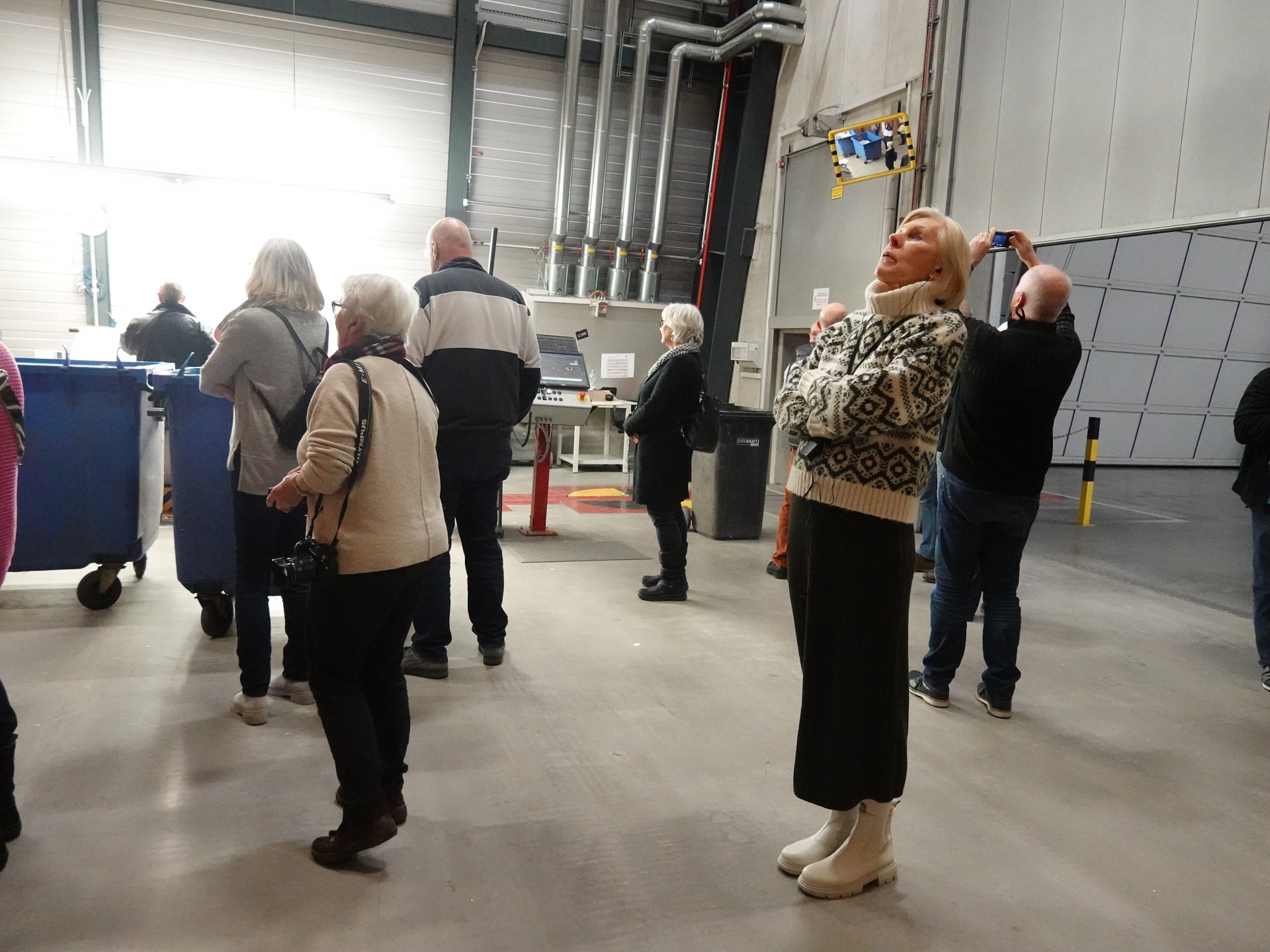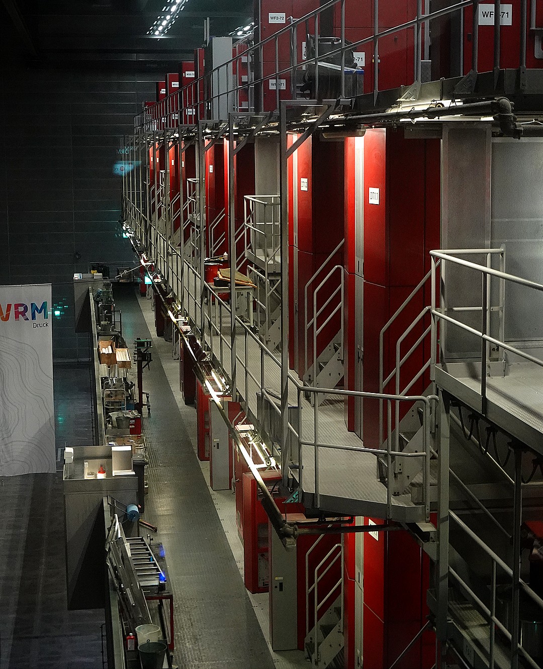 Im Besprechungsraum erläuterte vorab ein kurzer Film das Unternehmen. Der besseren Verständigung wegen mit Funkempfängern ausgestattet startete die kurzweilige Führung treppab und treppauf. Wir folgten dem Produktionsablauf, beginnend mit beeindruckenden Rollen im Papierlager. Autonome Fahrzeuge befördern diese zur jeweiligen Druckmaschine. Dort werden die Rollen zugeschnitten, bedruckt und gefaltet. Voraussetzung für den Druck sind die vor Ort auf den voluminösen Entwicklungsgeräten mittels analoger Fototechnik hergestellten Aluminium-Druckplatten. Diese müssen seiten- und farbrichtig dem Vierfarbdruck zugeführt werden. Spannend ist der Andruck. Im vollen Betrieb gilt es schnell die notwendigen Einstellungen durchzuführen um den Ausschuss zu minimieren. Die geprüften Zeitungsexemplare laufen nach dem Druck in die Verpackungsstrecke. Automatisiert werden Einleger ergänzt, die Exemplare gestapelt, etikettiert, verpackt und palettiert. Die schon während des laufenden Drucks wartenden Lieferfahrzeuge werden unverzüglich beladen und verlassen zügig die Durchfahrthalle.