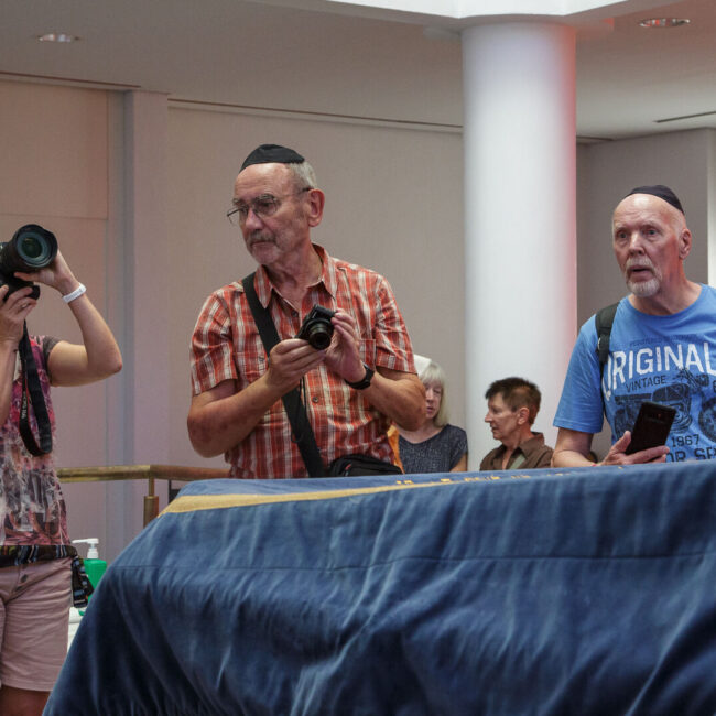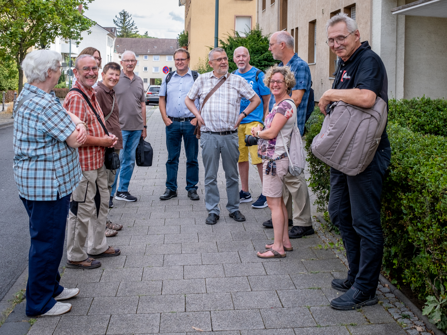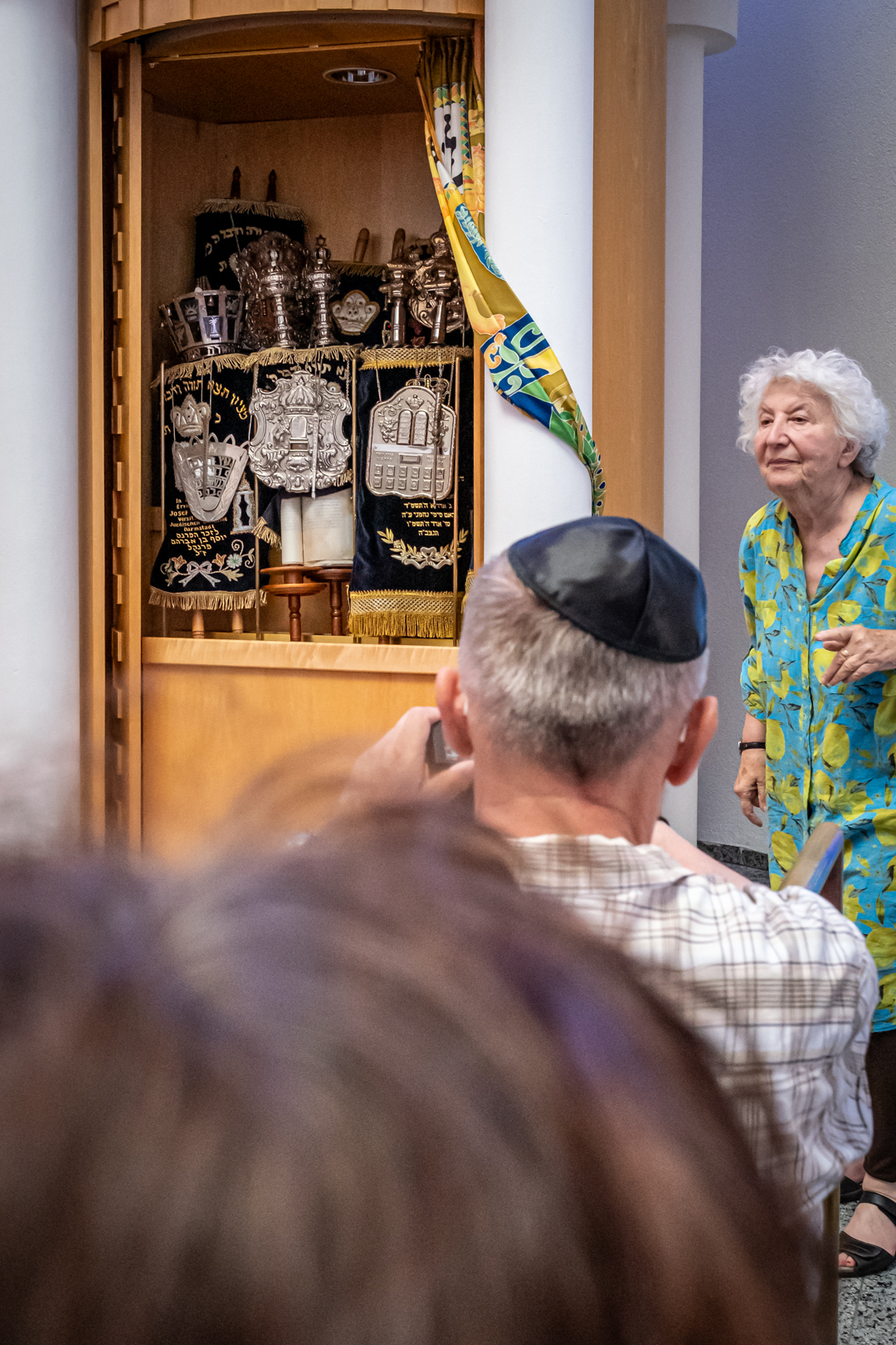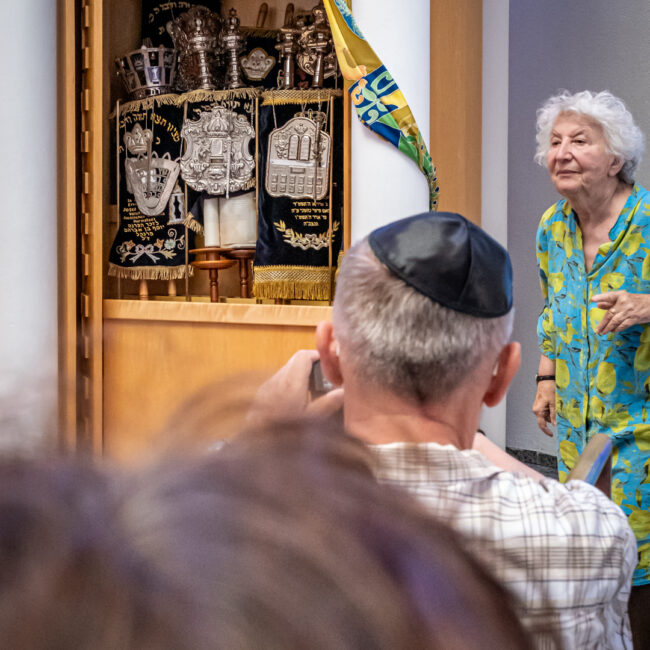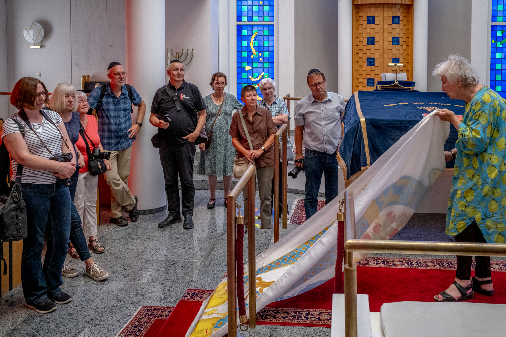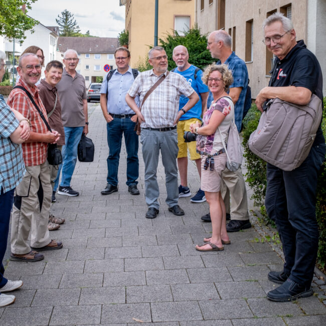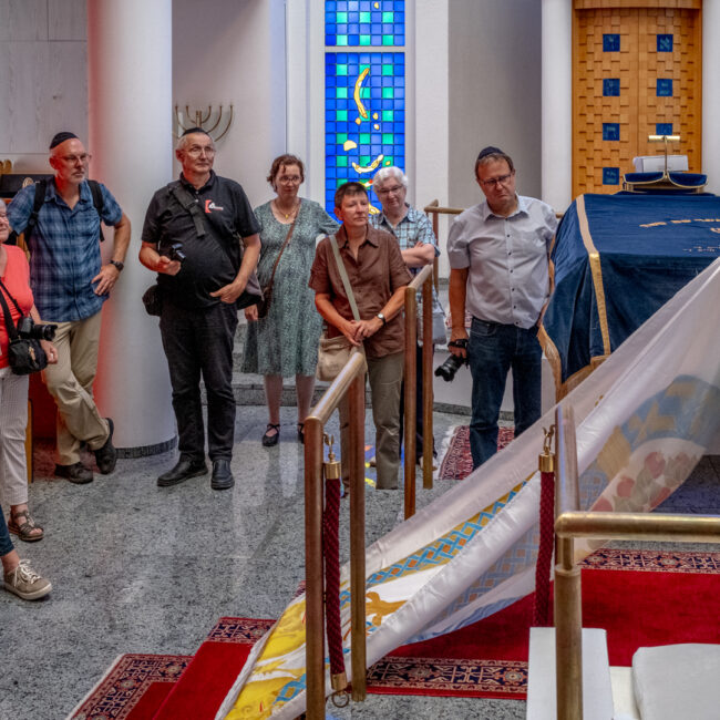 Unsere erste Sommertour in 2023 führte uns am 12.7. nach Darmstadt. Treffpunkt war an der Synagoge. Hier erhielten die 17 Mitglieder im Rahmen einer kurzweiligen und lehrreichen Führung einen Einblick in das Leben der jüdischen Gemeinde in Darmstadt: Glaubensjahr, Ablauf Gottesdienste, Rolle der Tora, Feiertage, Traditionen, Aktivitäten im Gemeindezentrum und vieles mehr. Die Fotografie kam dabei ebenfalls nicht zu kurz.
