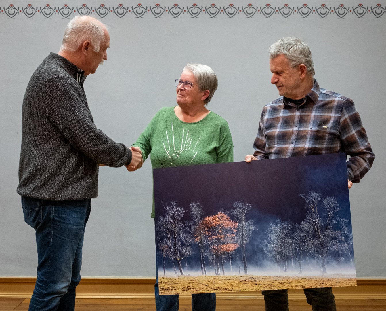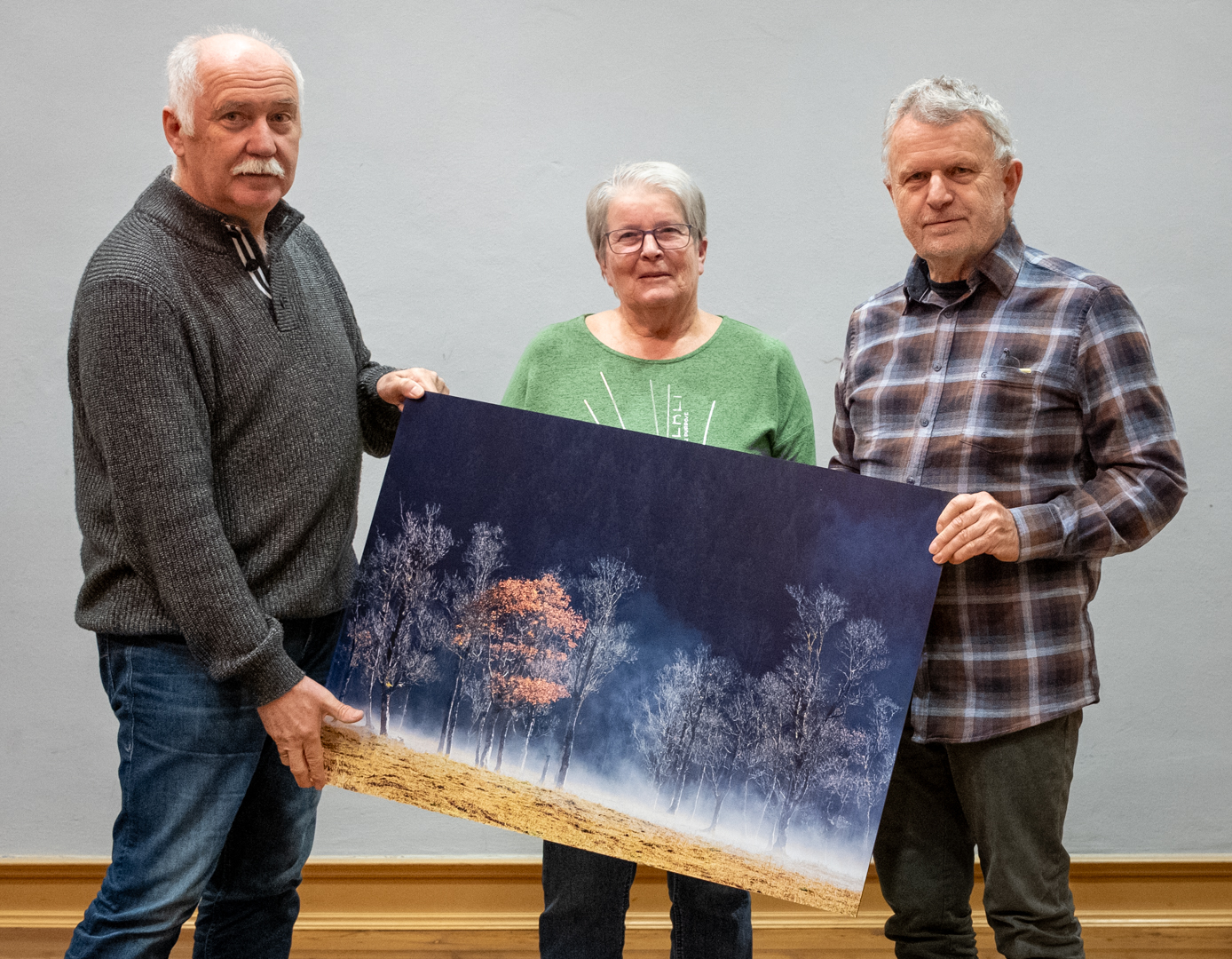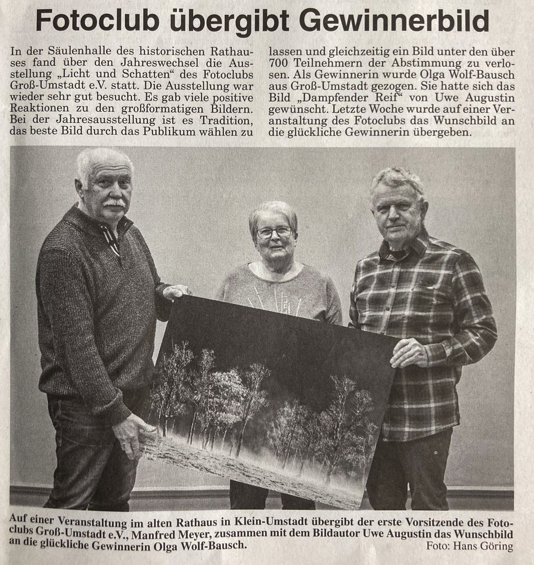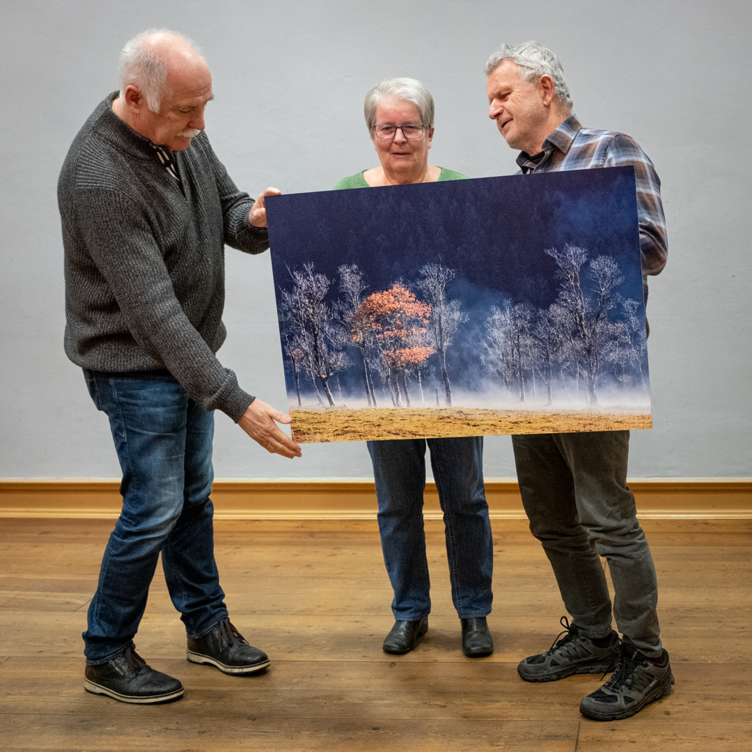 Die Bilder zeigen unsere Glücksfee Sarah von Kutzleben mit dem zweiten Vorsitzenden Volker Hilarius bei der Ziehung der diesjährigen Gewinnerin am ersten Clubabend nach Abschluss der Ausstellung. Anschließend wurde die Gewinnerin aus Groß-Umstadt benachrichtigt. Am 7.2.24 übergab der Vorstand Manfred Meyer das Wunschbild von Uwe Augustin, der bei der Übergabe assistierte, an die glückliche Gewinnerin.