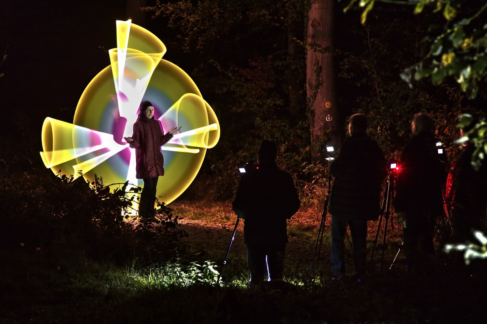 Danach ging es kurz den Berg hinauf auf den nahe gelegenen Grillplatz. Dort war es dunkel genug für die fotografischen Experimente. Zum Glück spielte das Wetter mit und es war auch nicht zu kalt für die Aufnahmen. Wir teilten uns in kleine Gruppen auf und versuchten uns an eigenen Sets. Es war schwieriger als gedacht. Mit Hilfe von Stefan konnten wir dann doch einige brauchbare Ergebnisse erzielen. Hilfreich war dabei auch, dass Norberts Frau sich als Model zur Verfügung gestellt hat. So wurde es kurzweilig und schnell spät. Ich glaube, alle gingen mit der Erwartung nach Hause, zumindest einige der Experimente in brauchbare Bilder umgewandelt zu haben.