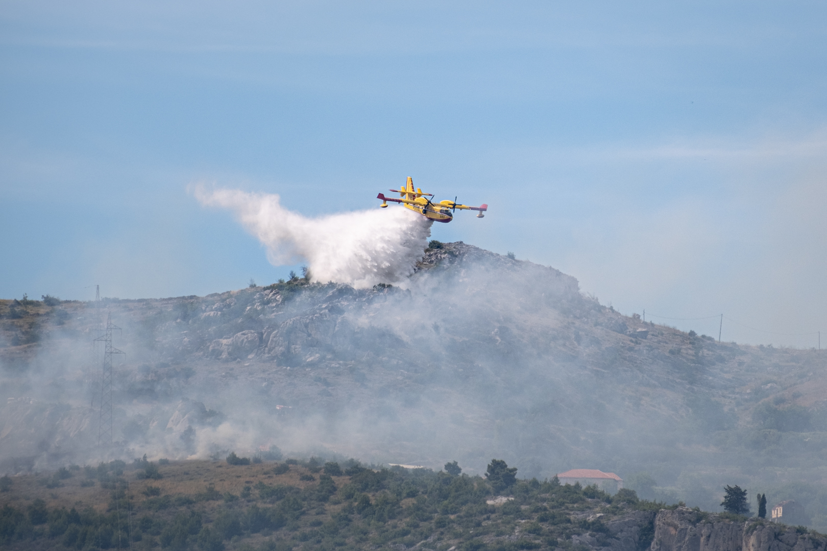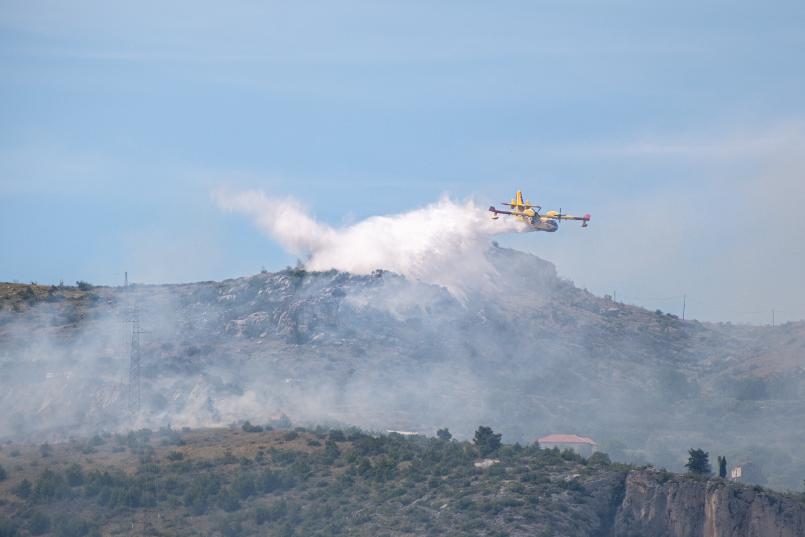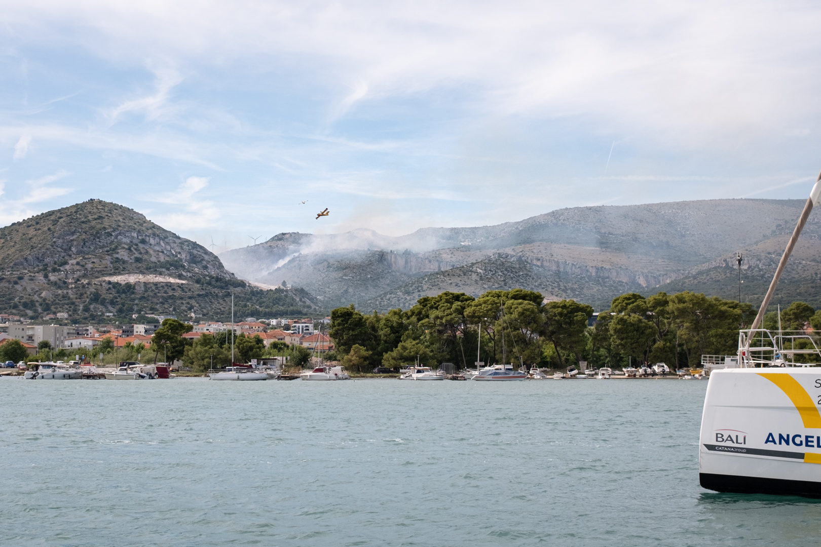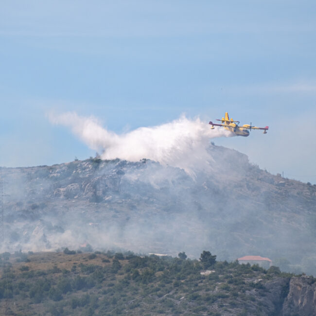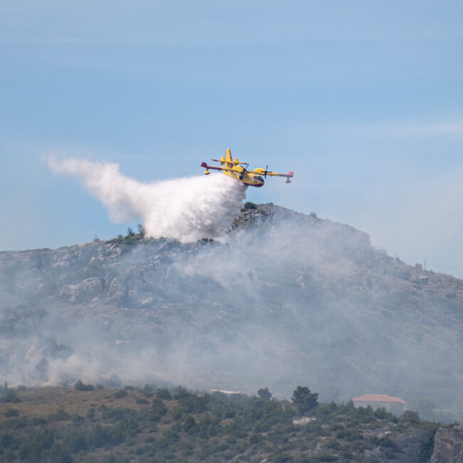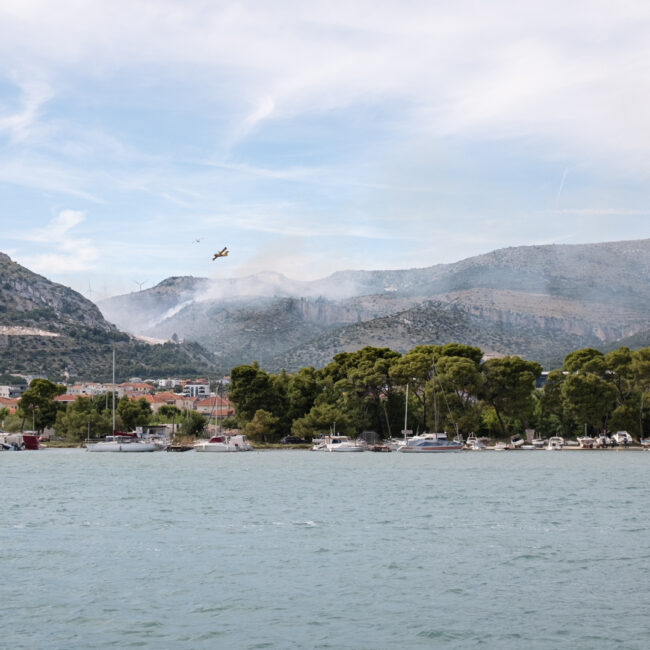 Diesmal gab es einen echten Einsatz gegenüber von unserem Yachthafen in Trogir. In etwa 3 km Entfernung brannte es in einem unwegsamen Gelände. Drei Löschflugzeuge zogen ihre Kreise. Der Tankvorgang war diesmal leider für uns nicht sichtbar. Auf leicht abweichenden Flugrouten verteilen sie ihre Last im Zielgebiet. Die Einsatzplanung musste dabei die direkt über den Yachhafen verlaufende An- und Abflugschneise vom Flughafen Split berücksichtigen. Der Flugverkehr wurde nicht eingestellt. Nach einer guten Stunde war die Show zu Ende und das Feuer erfolgreich gelöscht.