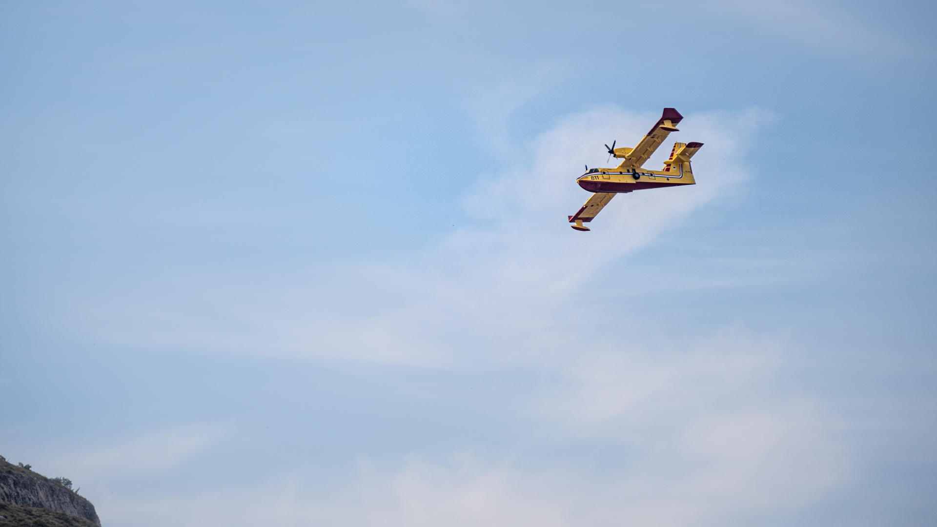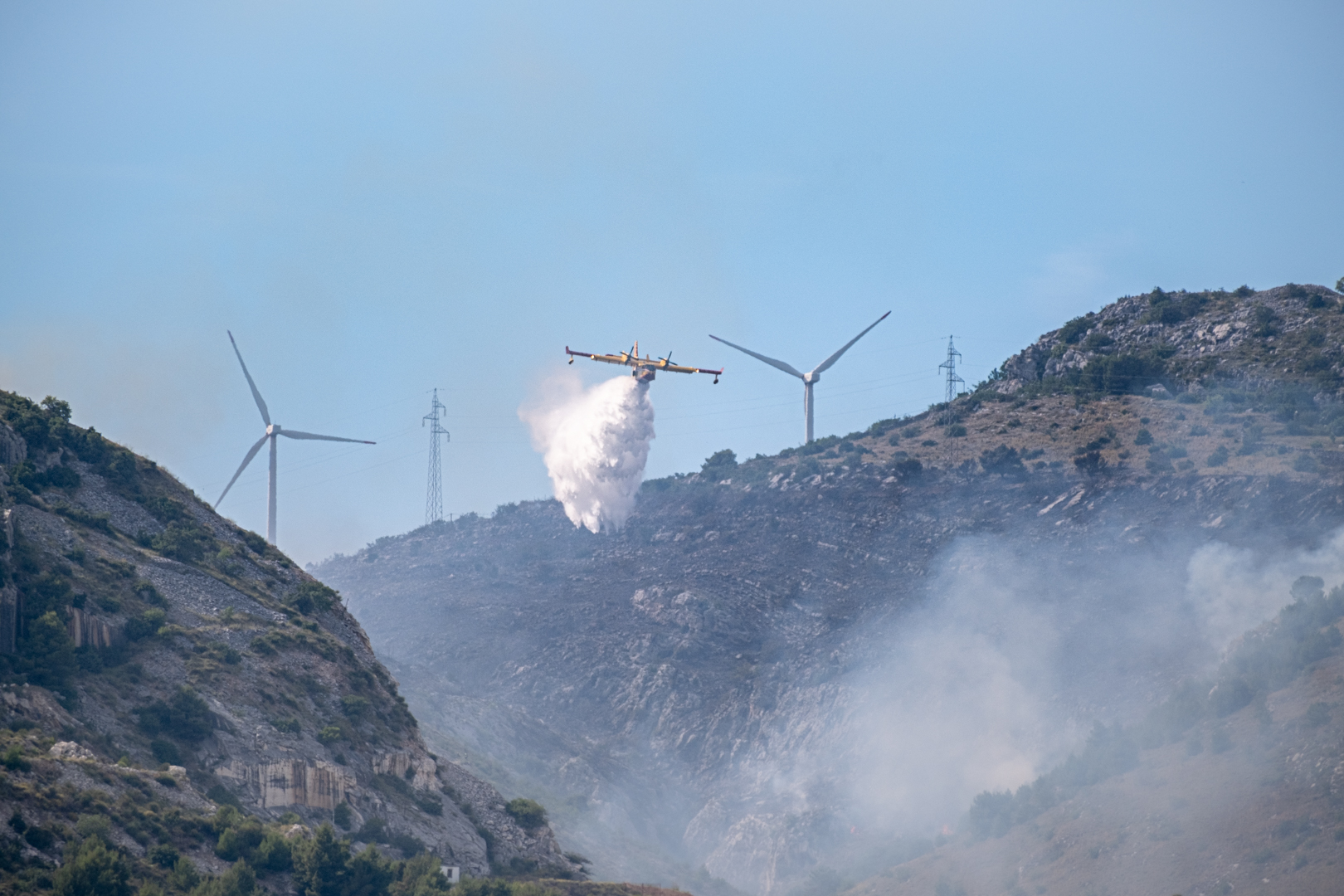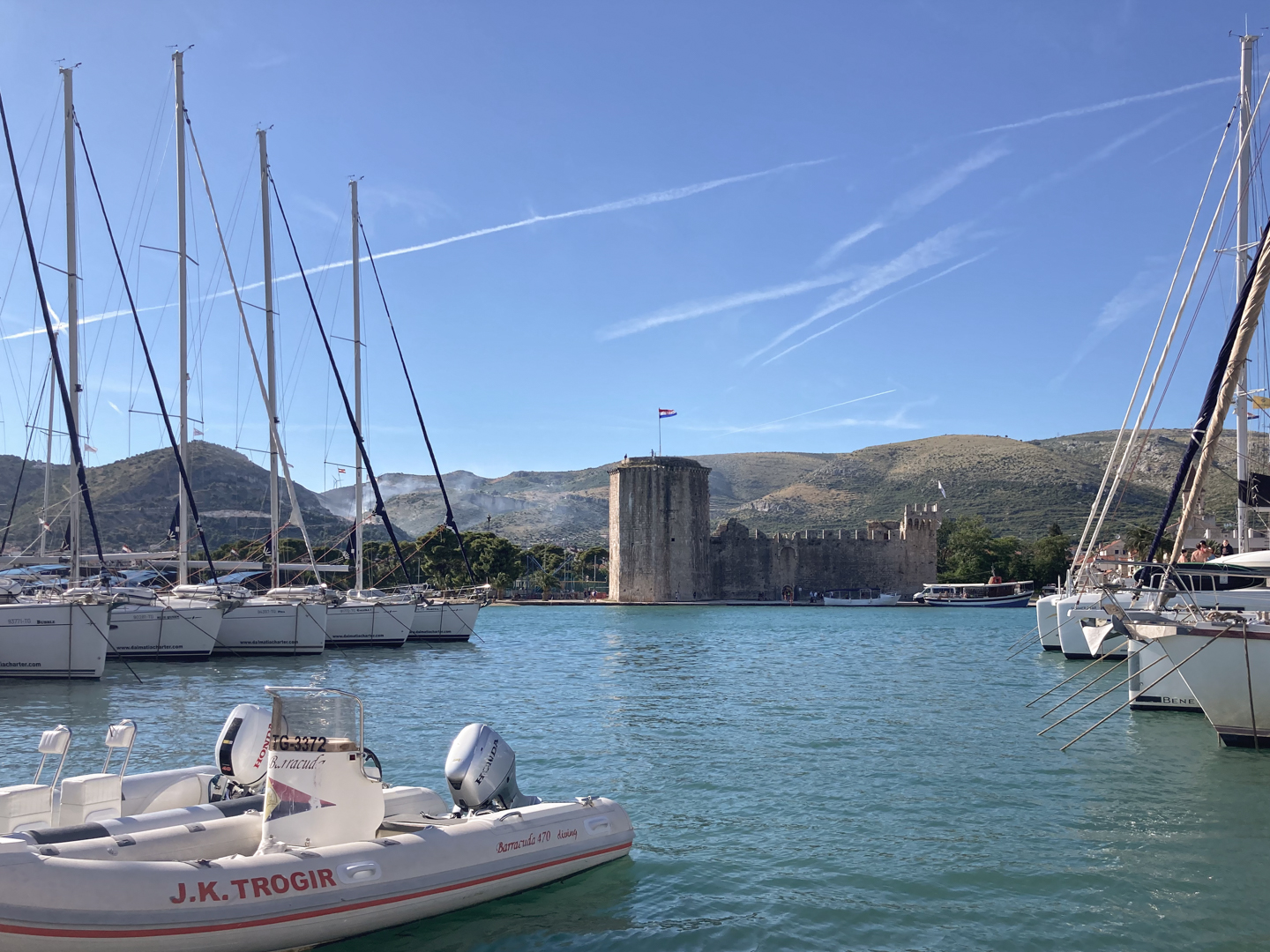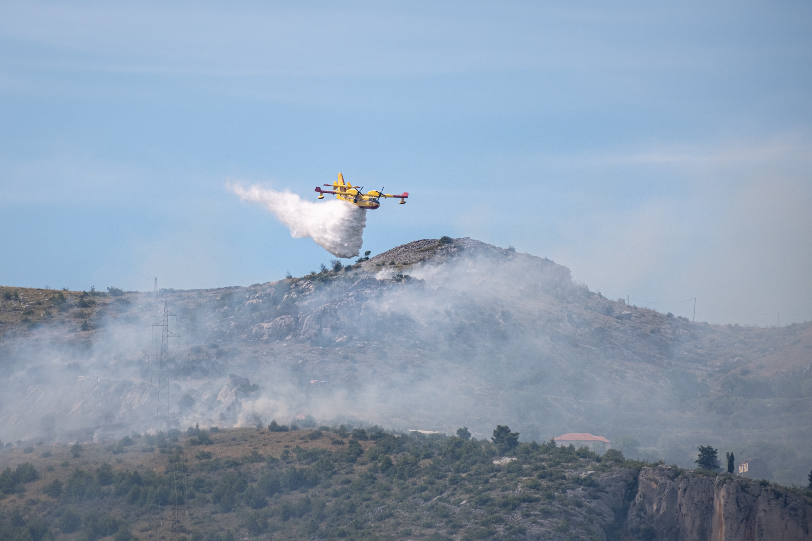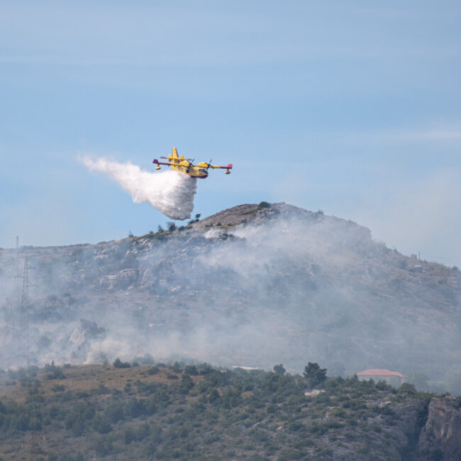 Diesmal gab es einen echten Einsatz gegenüber von unserem Yachthafen in Trogir. In etwa 3 km Entfernung brannte es in einem unwegsamen Gelände. Drei Löschflugzeuge zogen ihre Kreise. Der Tankvorgang war diesmal leider für uns nicht sichtbar. Auf leicht abweichenden Flugrouten verteilen sie ihre Last im Zielgebiet. Die Einsatzplanung musste dabei die direkt über den Yachhafen verlaufende An- und Abflugschneise vom Flughafen Split berücksichtigen. Der Flugverkehr wurde nicht eingestellt. Nach einer guten Stunde war die Show zu Ende und das Feuer erfolgreich gelöscht.