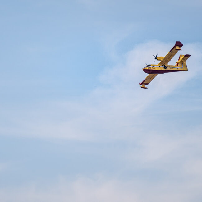In den letzten Jahren konnte man auf unseren Segeltörns in Kroatien des Öfteren Löschflugzeuge bei Trainingsflügen beobachten. Im Tiefflug nehmen sie in einem freien Seegebiet, in der Regel auf der Leeseite von Inseln, das Wasser auf. Dazu wurde ein Druckstrahlrohr im Flug ins möglichst ruhige Wasser getaucht, das dann in den Wassertank schießt. Je nach Flugzeugtyp kann die aufgenommene Wassermenge 5 to bis 10 to betragen. Die Betankung bei einer Geschwindigkeit von etwa 130 km/h dauert etwa 10-20 Sekunden bei einer Tiefflugstrecke von einem halben Kilometer. Der Wassertank wird dann über der fiktiven Brandstelle schlagartig entleert. Eine bewundernswerte Leistung der Piloten.