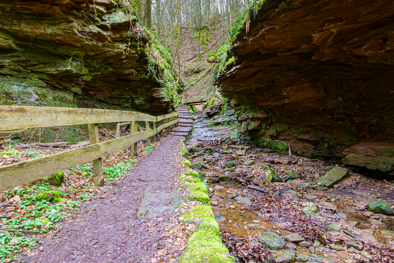Durch einen Vortrag wurde ich auf diese Schlucht oberhalb von Klingenberg aufmerksam gemacht. Ich bin schon oft in der Nähe vorbeigefahren und habe mit beim nächsten Mal die Zeit genommen in die Schlucht zu gehen. Die Schlucht ist bekannt als die Schlucht der Feuersalamander. Ich habe unten in Klingenberg geparkt, man kann bequem leicht ansteigend durch die Schlucht gehen. Ich war gegen Abend an einem trüben feuchten Tag unterwegs, also eine gute Zeit, um Feuersalamander zu sehen. Vorbei an einigen Felsenkellern und einem Schild geht es hinein in die Schlucht. Der Weg ist nur zu Fuß frei gegeben, Fahrräder darf man nur schieben, sind aber von mir nicht empfohlen. Der Weg war etwas matschig und rutschig, man sollte trittsicher sein. Halbschuhe mit grobem Profil waren o.k., besser wären knöchelhohe Wanderschuhe gewesen. Ich hatte die Sony RX100 dabei und habe aus der Hand fotografiert, alle Bilder in Camera RAW. Mit fortschreitender Zeit wurde es etwas düster. Früher hatte ich mit der RX100 nur bis ISO 800 fotografiert, wegen des dann ansteigenden Rauschens. Hier habe ich Bilder mit ISO 3200 fotografiert und in LrC das deutlich erkennbare Rauschen mit der KI-unterstützten Funktion reduziert. Das ging recht problemlos, meistens hatte ich den Regler auf 50 stehen – dauert ein paar Minuten auf meinem Notebook, lohnt sich aber. Leider habe ich keine Feuersalamander gesehen, ich habe aber vor nochmals in die Schlucht zu gehen und werde mir etwas mehr Zeit mitbringen. Auch ohne Salamander gesehen zu haben kann man schöne Eindrücke sammeln und schöne Bilder schießen.