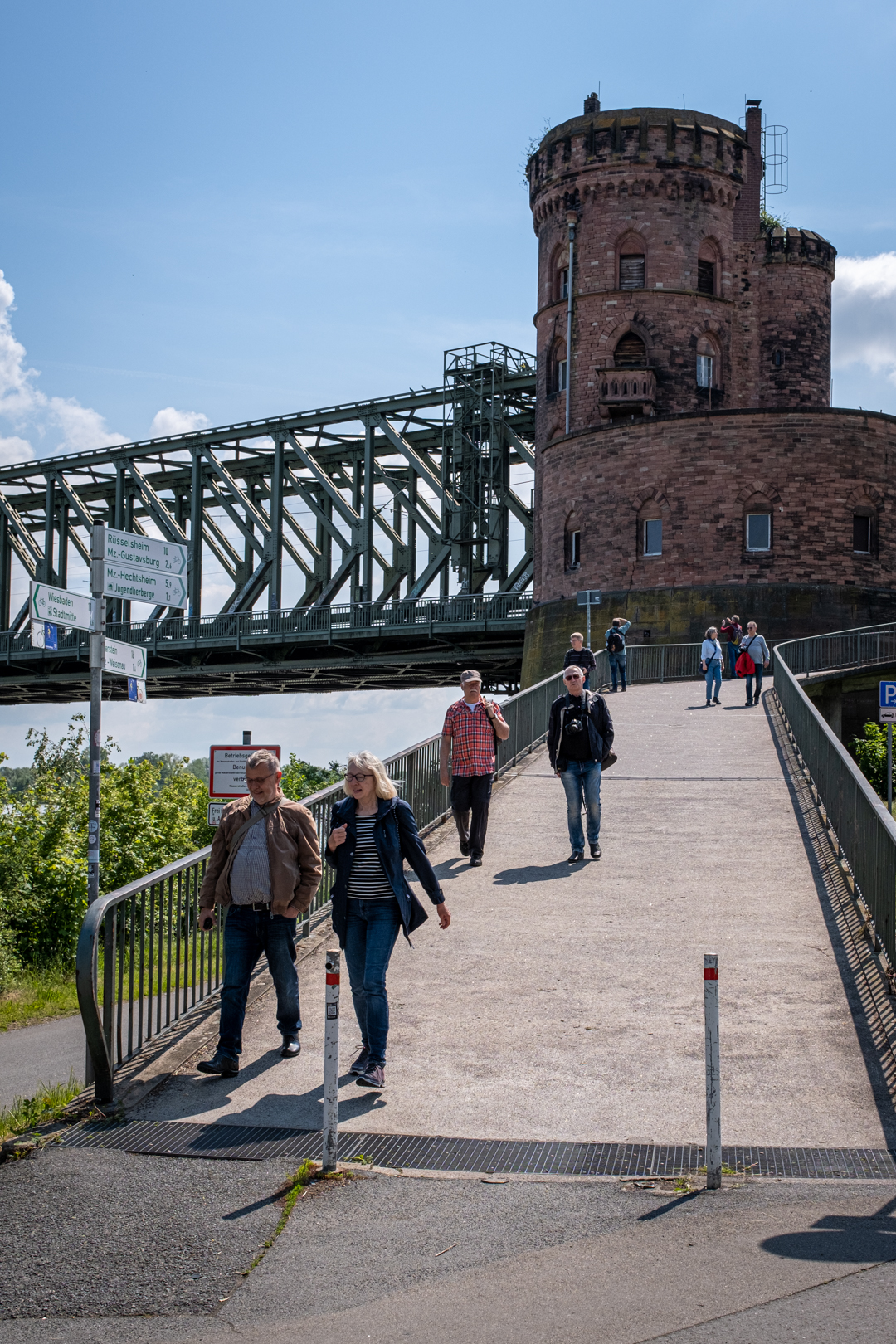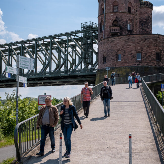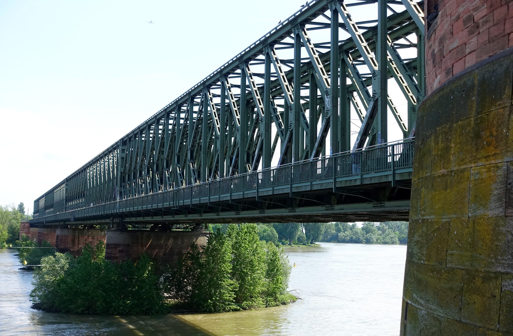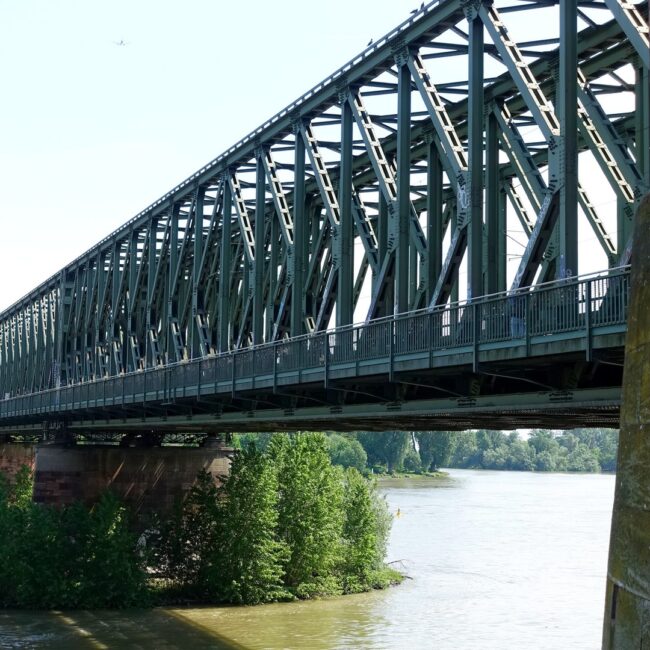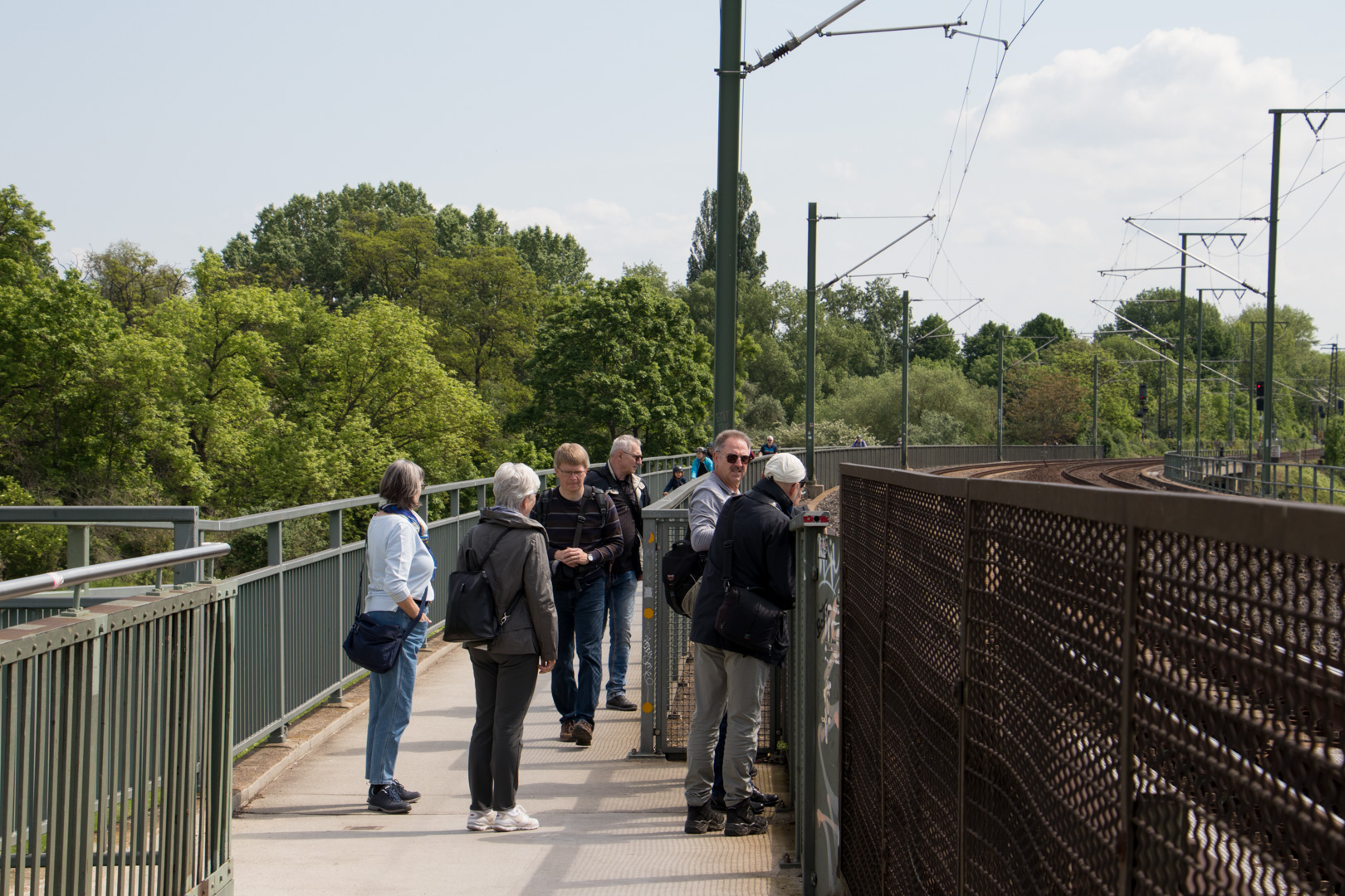 Das Wetter war gnädig. Fast pünktlich ging es im überfüllten Zug nach Gustavsburg. Dort warteten bereits die Autofahrer auf die Wandergruppe. Wir gingen direkt zum Aufstieg auf die Mainzer Südbrücke, eine der bedeutendsten Eisenbahnbrücken in Deutschland. Dort erläuterte Volker die Highlights aus der Geschichte der 1863 fertiggestellten Brücke. Mit Staunen konnten wir viele technische Details auf der Brücke anschauen, die viele sonst einfach übersehen hätten. So zum Beispiel die schräg geschnittenen Gleisanschlüsse, die die Wärme-Ausdehnung der einen Kilometer langen Brücke aufnehmen. und die zahlreichen Nieten und Schrauben, die das Bauwerk zusammenhalten. Gestaunt habe auch alle über die Bauzeit von nur vier Wochen für die Behelfsbrücke, die nach der Zerstörung im zweiten Weltkrieg errichtet wurde.
