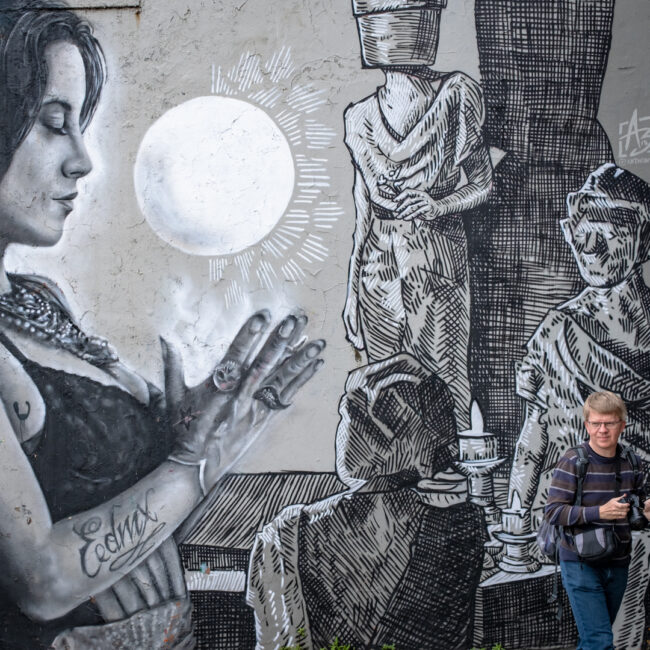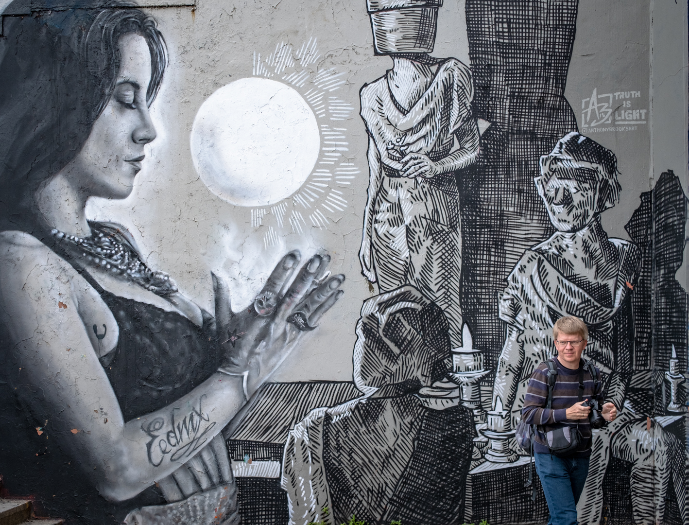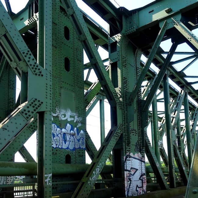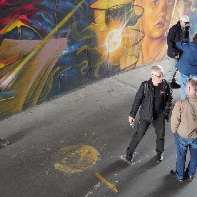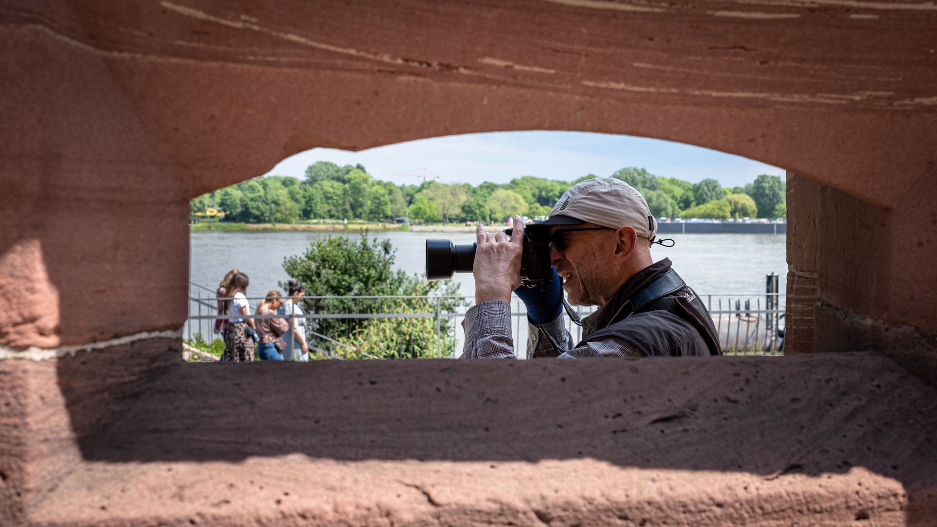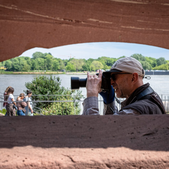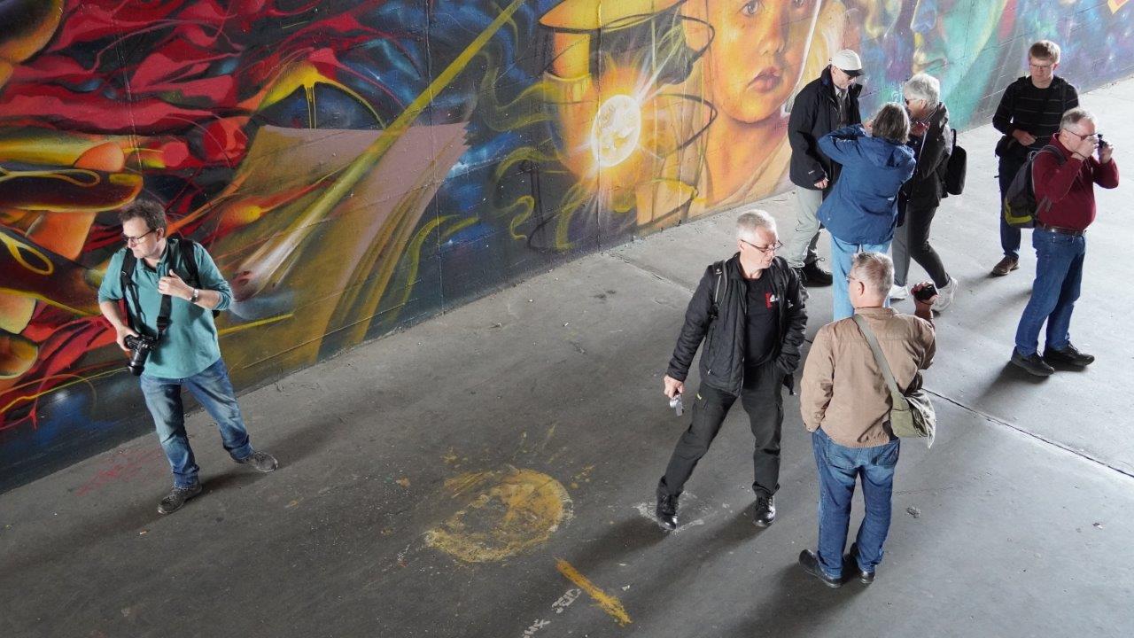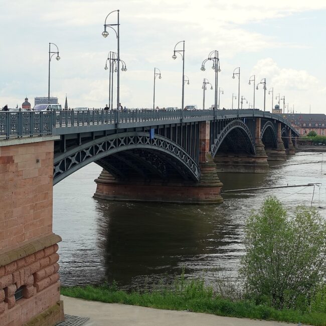 Über die breite Theodor-Heuss-Brücke erreichten wir dann Mainz-Kastell, das ja jetzt ein Stadtteil von Wiesbaden ist. Unter dem Brückendurchgang gab es einen Fotohalt an den neu gestalteten, aufwendigen Graffiti. Beeindruckend war welche farbenfrohen Motive heute auf diese Weise entstehen. Zur Kaffee-Pause am Castellanum genossen wir den Blick über den Rhein auf die mit Baucontainern zugestellte Mainzer Rhein-Promenade. Der Weg zurück führte uns nun durch die Natur am Rhein-Ufer auf der Wiesbadener Seite über die Insel Maaraue. Nach den Brücken vier und fünf erreichten wir Kostheim. Von da war es Brücke sechs über den Main nach Gustavsburg. Brücke sieben gab es dann im Park in Gustavsburg auf dem Weg zum Bahnhof, dem Ausgangspunkt der Tour.