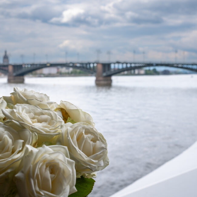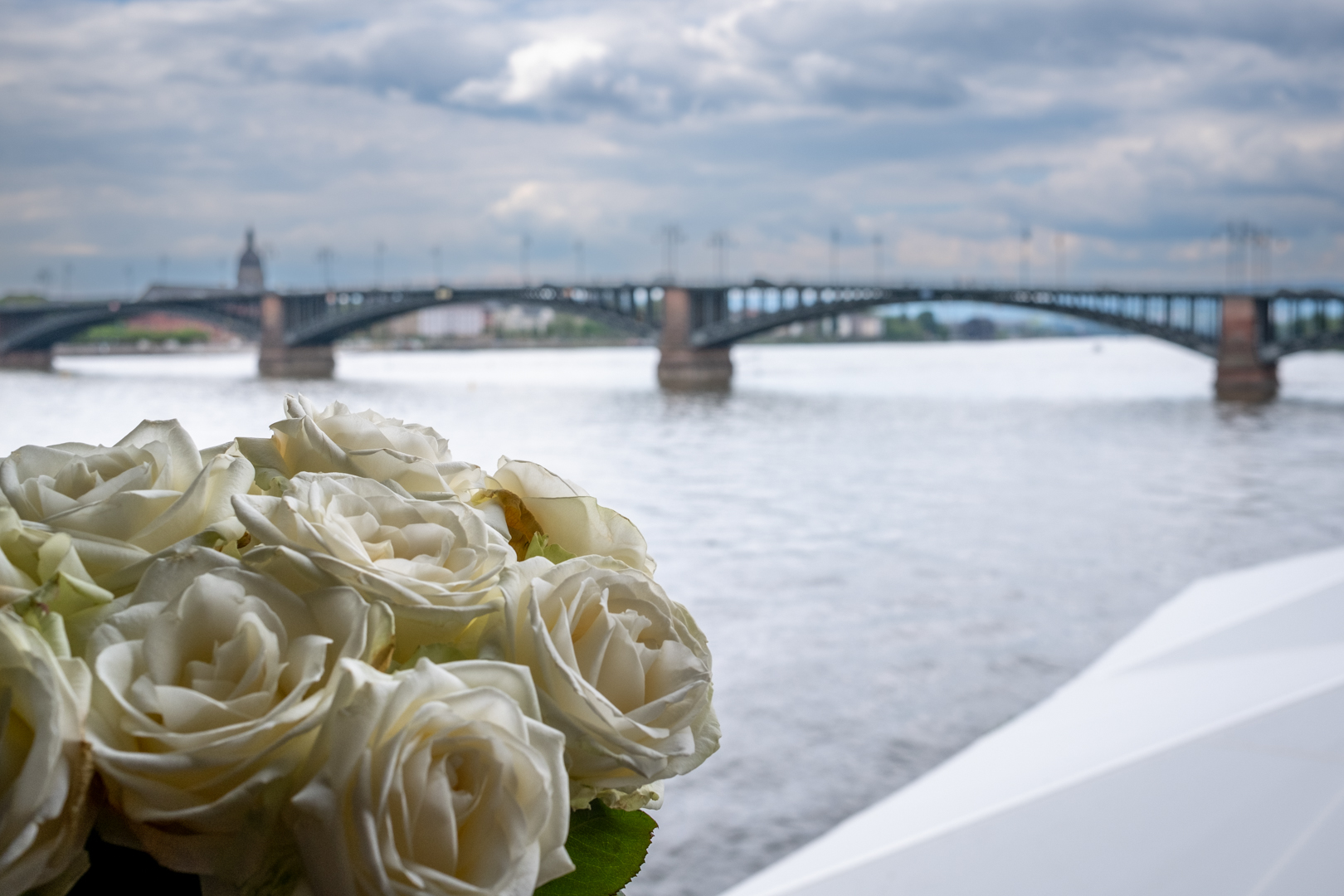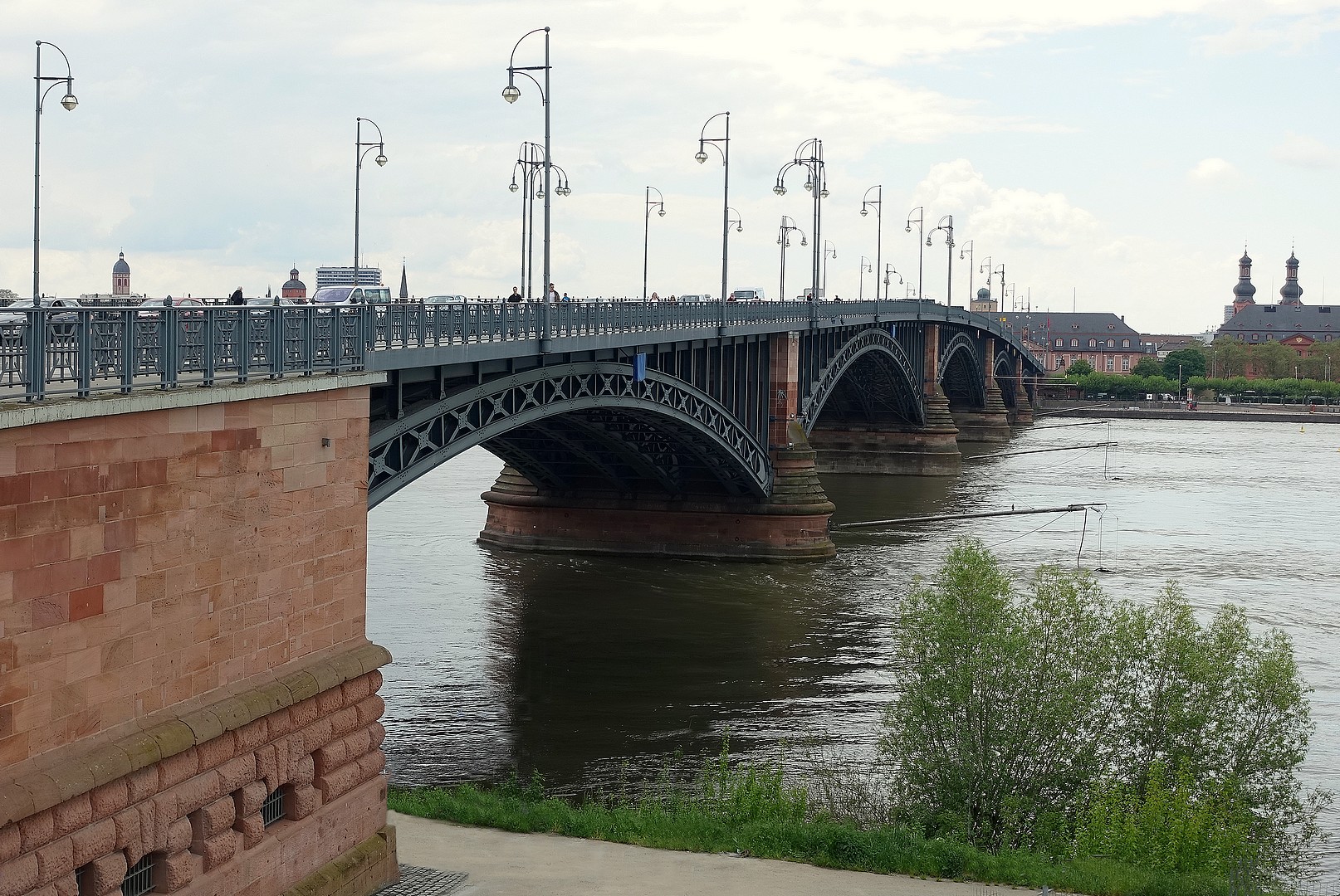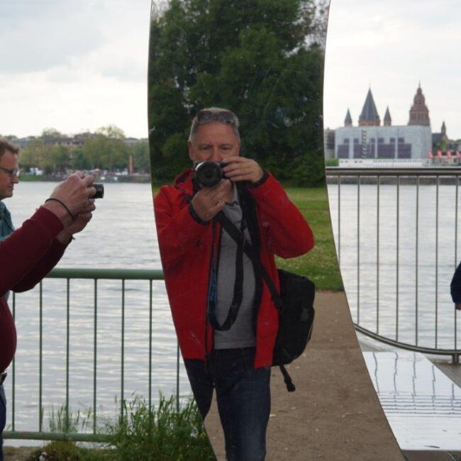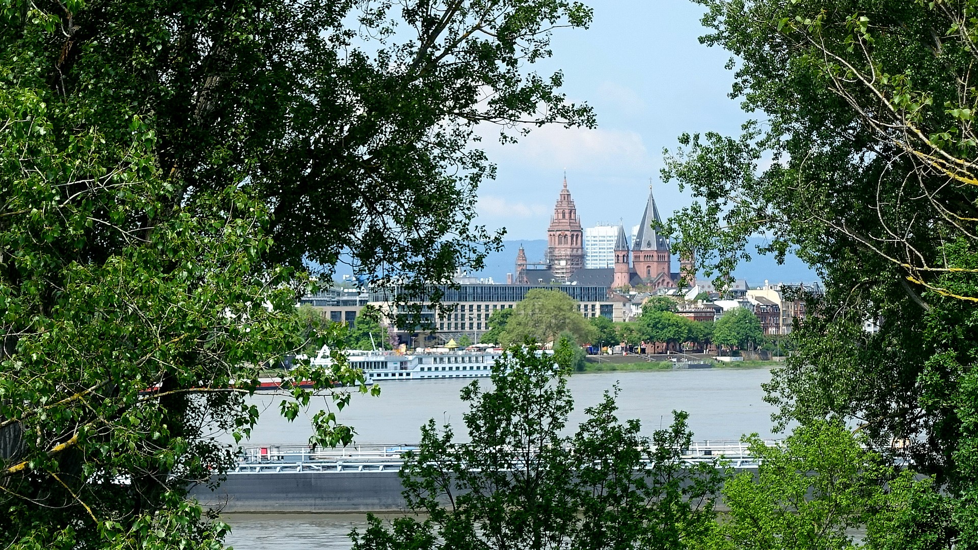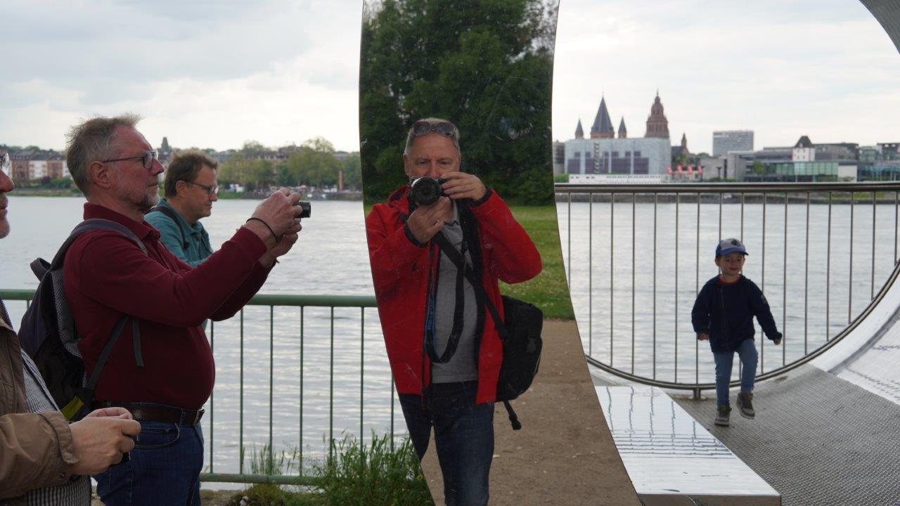 Begleitet von zahlreichen Radfahrern erreichten wir auf dem schmalen Seitenweg das andere Ufer des Rheins. Am Rheinufer wanderten wir weiter nach Mainz. Bei sonnigem Wetter gab es die erste Rast in einem großen Freiluft-Café am Rhein-Ufer. Eine kleine Brücke brachte uns auf die Rhein-Promenade in Mainz.