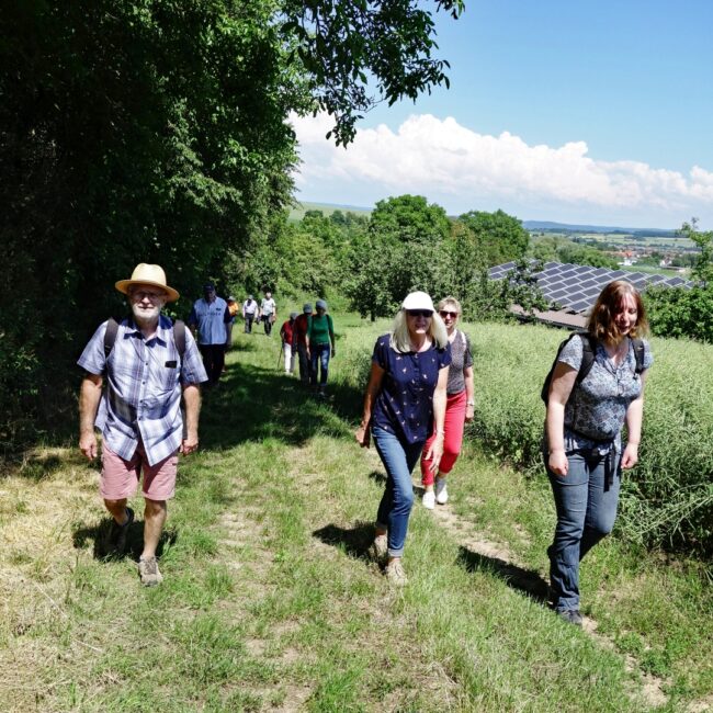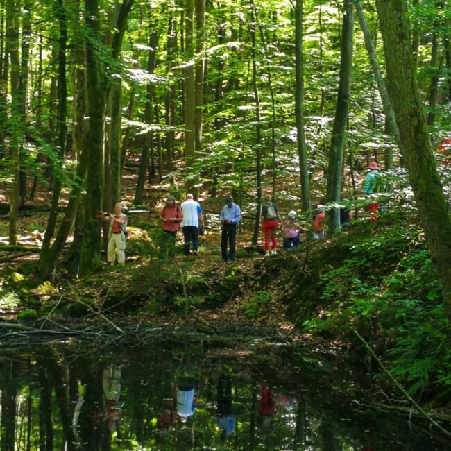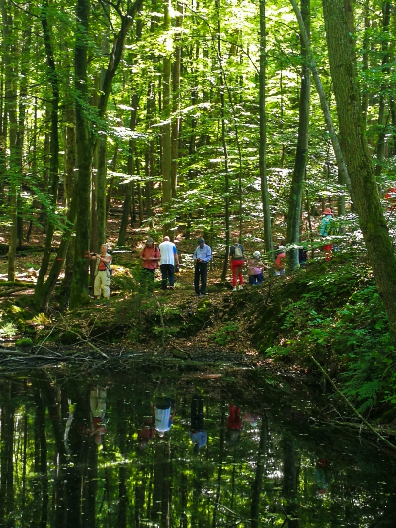 Nachdem wir uns wochenlang nur per Videochat gesehen haben, starteten wir am 13.06.2020 zu einer Wanderung. Treffpunkt war Radheim, von dort führte uns Herbert zur Pflaumbachquelle, die im Wald oberhalb von Radheim entspringt. Das Flüsschen, das auch Mosbach oder Welzbach genannt wird, mündet bei Aschaffenburg in den Main.