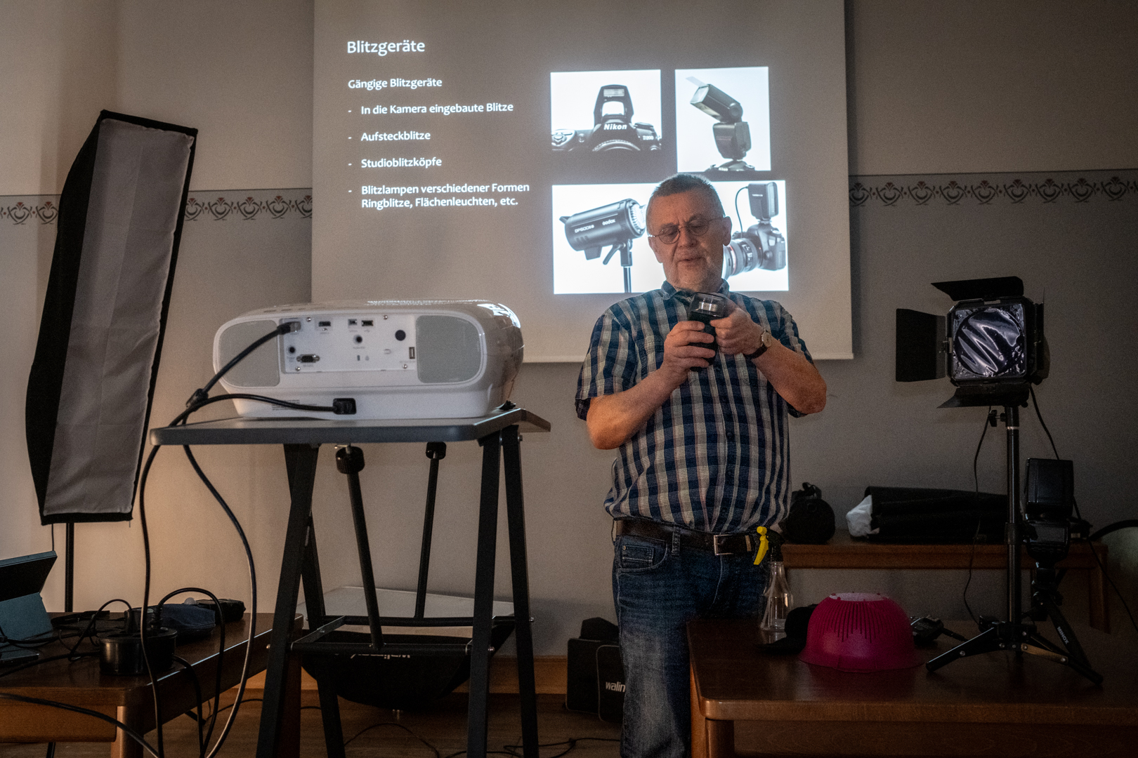 Organisiert und moderiert hat die gesamte Veranstaltung Volker Hilarius. Ein anschaulicher Vortrag beleuchtete am Vormittag das Thema „Licht“ im Allgemeinen und den Einsatz von künstlichem Licht (Blitz, Dauerlicht) im Besonderen. Das Zusammenspiel mehrerer künstlicher Lichtquellen beim Aufbau eines Sets war einfacher wenn man diese Grundlagen verstanden hatte. Die Besonderheiten der Kameraeinstellungen für die Blitzfotografie bildete den Abschluss.