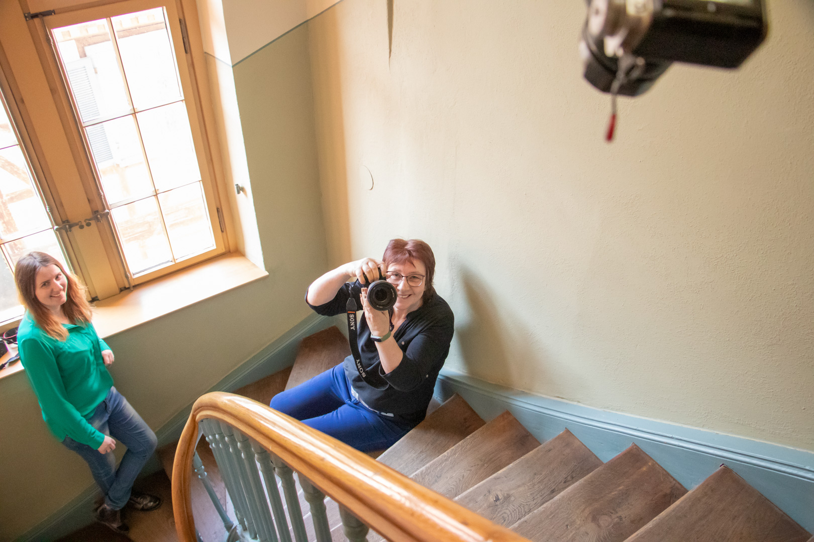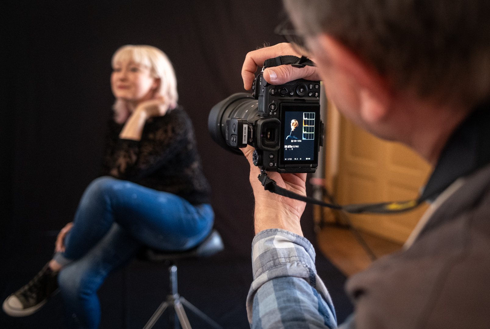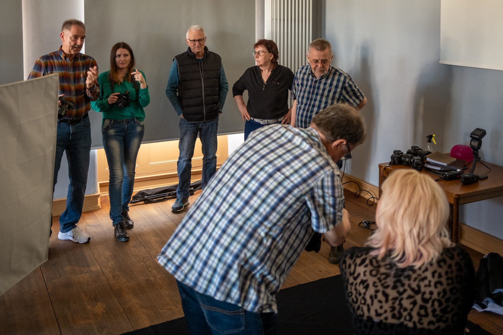 Nach der Mittagspause wurden zwei Sets mit verschiedenen Hintergründen aufgebaut. Die Teilnehmer haben die unterschiedlichen Lichtsetzungen selbst ausprobiert und verändert. Als erfahrenes Model hatte der Fotoclub Nicole engagiert. Hintergründe wurden geändert, Blitze versetzt und mit LED-Licht und natürlichem Fensterlicht fotografiert.