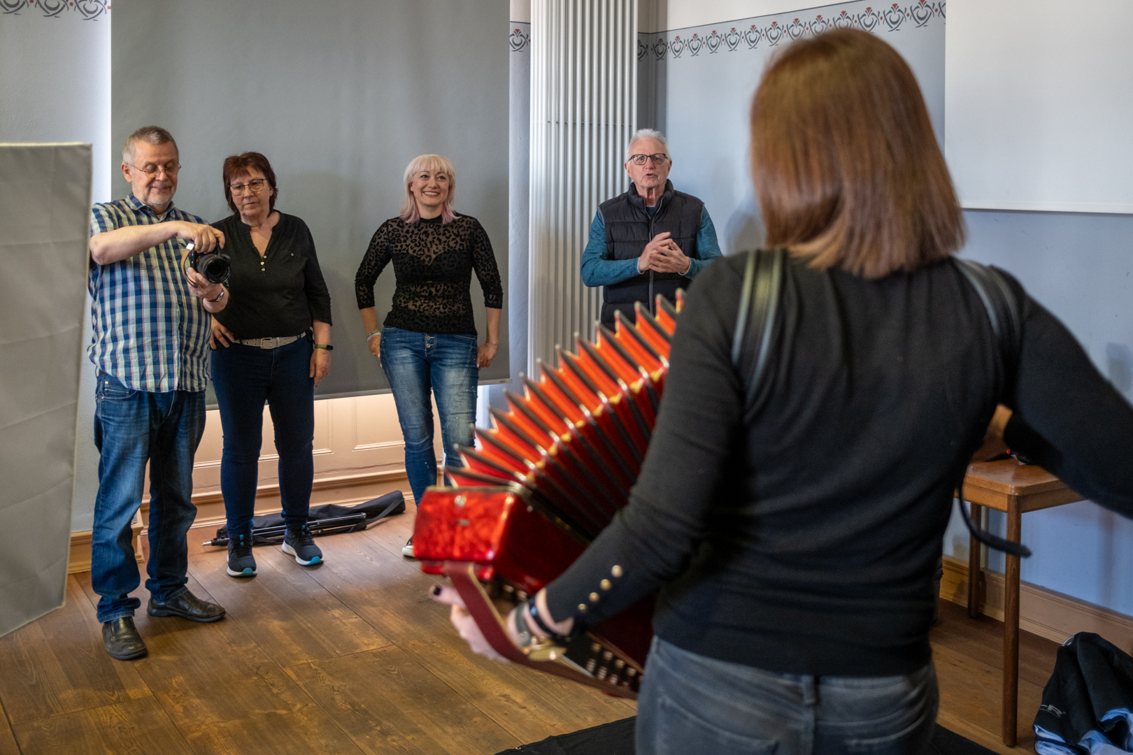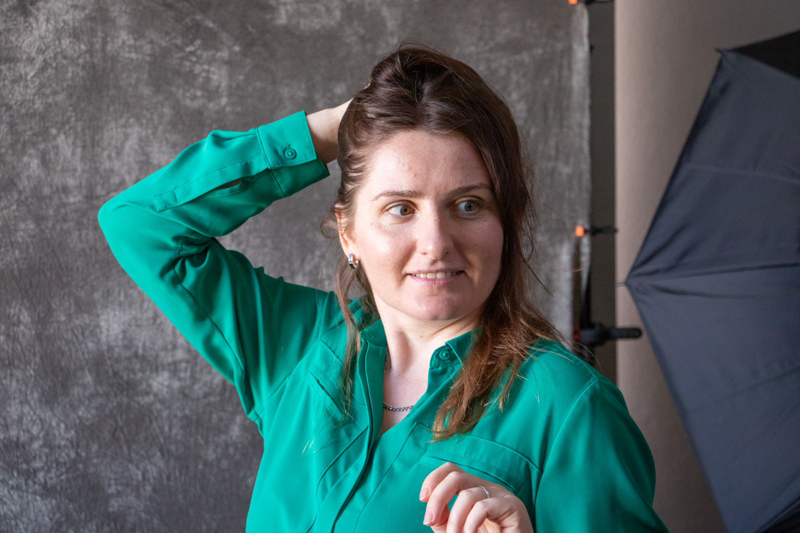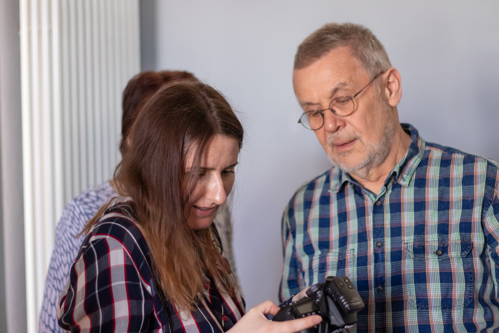Nach der Mittagspause wurden zwei Sets mit verschiedenen Hintergründen aufgebaut. Die Teilnehmer haben die unterschiedlichen Lichtsetzungen selbst ausprobiert und verändert. Als erfahrenes Model hatte der Fotoclub Nicole engagiert. Hintergründe wurden geändert, Blitze versetzt und mit LED-Licht und natürlichem Fensterlicht fotografiert.
